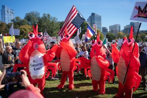 People dressed as the founding fathers, the Statue of Liberty, and even dinosaurs. Masses of signs reading, “we only need one orange monarch” (with an image of a Monarch butterfly), and “we have no king” flooded in from every entrance to the park. People holding American flags swarmed the mainstage, where speakers like Mayor Michelle Wu and Sen. Elizabeth Warren spoke to an enormous crowd.